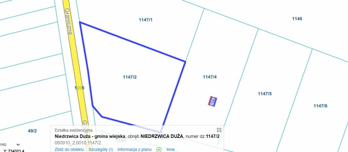 Działka w Niedrzwicy Dużej w pierwszej linii zabudowy.Numer nieruchomości to 1147/2. Powierzchnia wynosi 2250 m2 przy wymiarach ok. 62 x 48 x 35 x 42 m. Działka w kształcie trapezu.